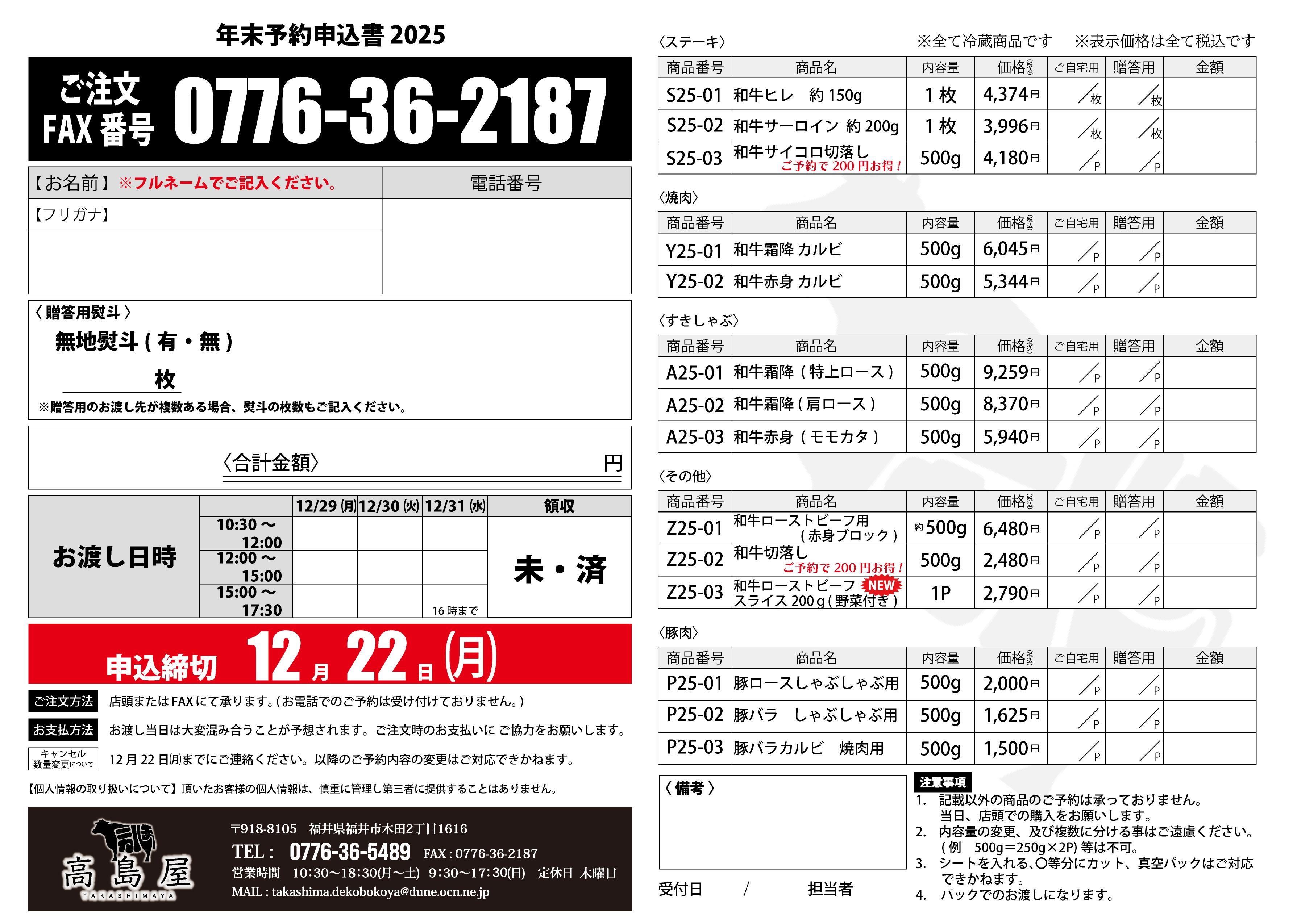 年末精肉予約申し込み用紙(PDF)ダウンロード