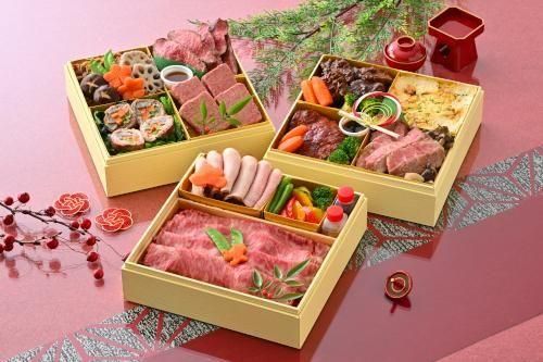 一段目:しぐれ煮(120g)、稀少部位ステーキ(120g)、八幡巻き(160g)、コンビーフ(150g)、シャリアピンソース(15g)